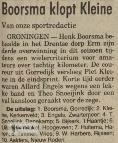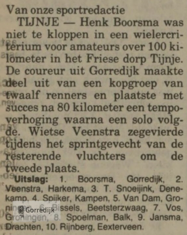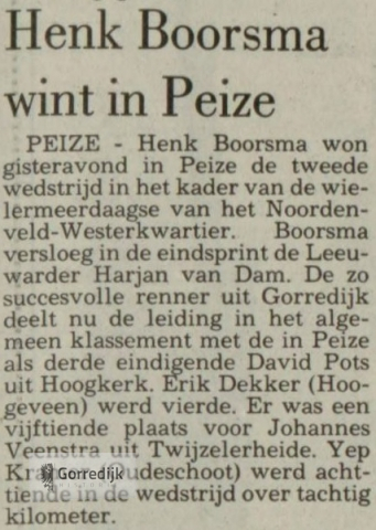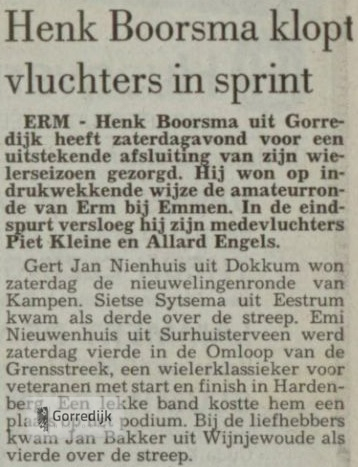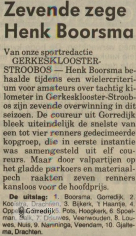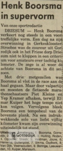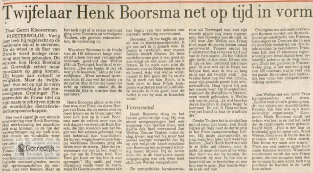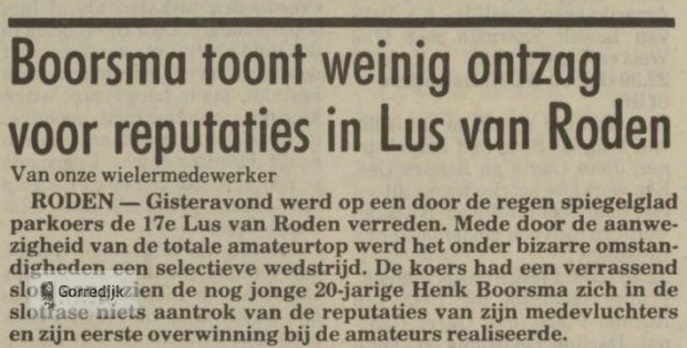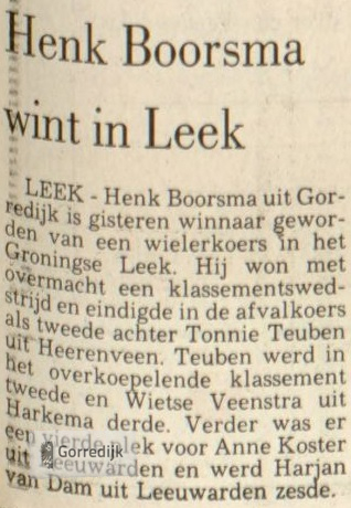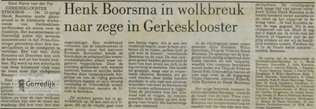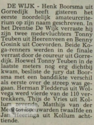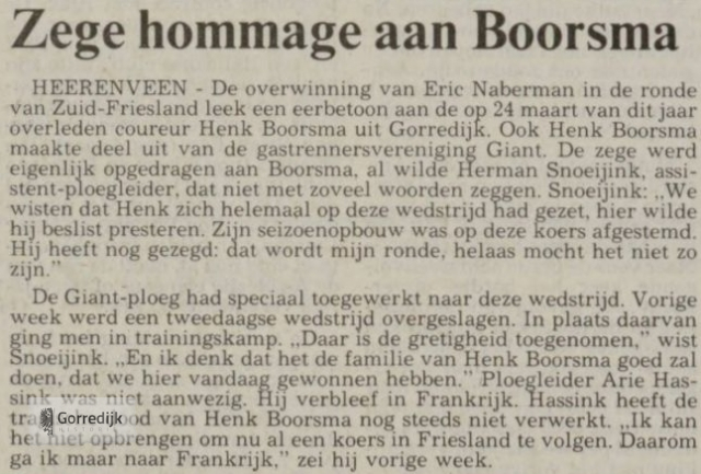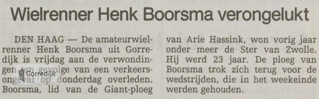 Wielrenner Henk Boorsma (22) gold als een van de meest veelbelovende amateurwielrenners in Friesland. In 1989 werd hij Fries Kampioen en boekte dat seizoen elf overwinningen in Friese criteria, en hij was een van de kandidaten voor de nationale tijdritploeg over honderd kilometer. In 1988 vestigde hij landelijk de aandacht op zich door de openingsklassieker van het seizoen, de Ster van Zwolle, op zijn naam te schrijven.In 1990 is Henk Boorsma ten gevolge van een verkeersongeval om het leven gekomen. Hij mocht maar 22 jaar worden.Hieronder enkele wedstrijdverslagen van zijn glorieuze overwinningen en nog één van zijn laatste (1990) interviews in de Leeuwarder Courant.De lijst van overwinningen