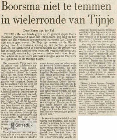 Twee jaar geleden won hij de Ster van Zwolle en leek Boorsma in sneltreinvaart naar de nationale top door te stoten. Sindsdien lijkt de ontwikkeling enigszins gestagneerd, ondanks de twaalf criteriazeges die hij vorig jaar boekte. Schijn kan bedriegen. De opofferingsgezindheid van Henk Boorsma is groot. Zijn standpunt: het doet er niet toe wie, als maar iemand van onze ploeg wint. Boorsma: „Ik siet der faak goed by, mar santjinde wurde telt net. Ferjitten wurdt dat ik twahündert meter foar de finish noch op kop riid en de sprint oanlük foar de oaren. Dan wurdst santjinde en sizze de minsken: o ja, hy die ek mei. Mar foar dysels kinst in foldien gefoel ha, asto witst datst goed riden hast." De meeste renners zitten in de conditionele opbouw, zo ook Henk Boorsma. Hoe zijn conditie ook is, hij zoekt altijd de aanval. „It is myn handikap dat ik soms te hurd fan stapel rin. Mar dan giet it sa lekker, dat ik it soms sels net iens yn 'e gaten ha. Ik moat wat suniger ride? Ik sil besykje dêr dit jier om te tinken."