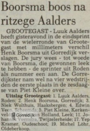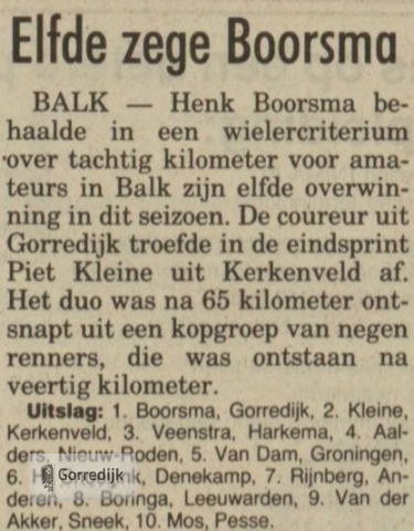 Verder rijden in de vluchtgroep van negen was voor Boorsma niet lucratief. „Ik had geen zin om de sprinters Luuk Aalders of Wietse Veenstra naar de meet te brengen. Daarom ben ik zeventien ronden voor het einde weggesprongen uit de groep. Toen Piet Kleine mijn spoor volgde, wist ik dat we weg zouden blijven", grijnsde Boorsma na de race. Boorsma's sloopactie was nog lang niet voltooid. In een perfecte samenwerking met Piet Kleine ringeloorde hij nog eens alle vijftien coureurs die in de wedstrijd mee fietsten. En daarmee werd duidelijk dat of Piet Kleine of Henk Boorsma de opvolger zou worden van Bert Schoneman, die in 1975 de laatst gehouden wielerronde van Balk won. In de eindsprint moest de boomlange Kleine duidelijk het onderspit delven. Kleine:„Dat vond ik niet! erg. Ik was al lang blij dat ik vandaag mee kon draaien. Ik heb de laatste vier weken tijdens mijn vakantie niet op de fiets gezeten. Als je dan een wedstrijd afsluit met een tweede plaats, dan kun je alleen maar tevreden zijn." Uitslag wielerronde van Balk: 1 Henk Boorsma, Gorredijk: 2. Piet Kleine, Kerkenveld: 3. Wietse Veenstra, Harkema; 4 Luuk Aalders, Nieuw Roden: 5 Harjan van Dam, Groningen. 6 Herman Snoeyink. Denekamp; 7. Willem Rijnberg. Anderen; 8. Robert Boringa. Leeuwarden; 9 Kees van der Akker. Sneek; 10 Paul Mos. Pesse; 11. Mathijs van der Meer. Leeuwarden: 12 Theo Snoeyink. Denekamp; 13 Gerard Dekker. Hoogeveen; 14. Teake Oppewal, Sneek; 15. Marcel Kranenburg, Wolvega, 16. Mathijs de Vries, Joure; 17 Harm Wind. Delfstrahuizen, 18. Wilco Spoelman. Balk; 19. Tonnie Teuben. Heerenveen; 20. Piet Pomstra, Grootegast.