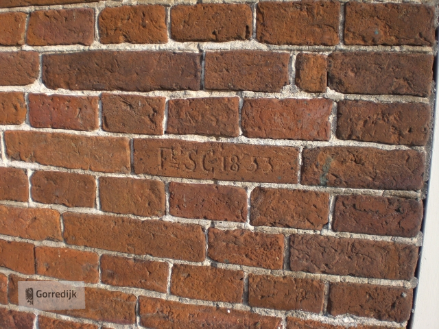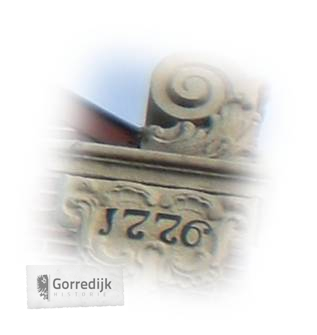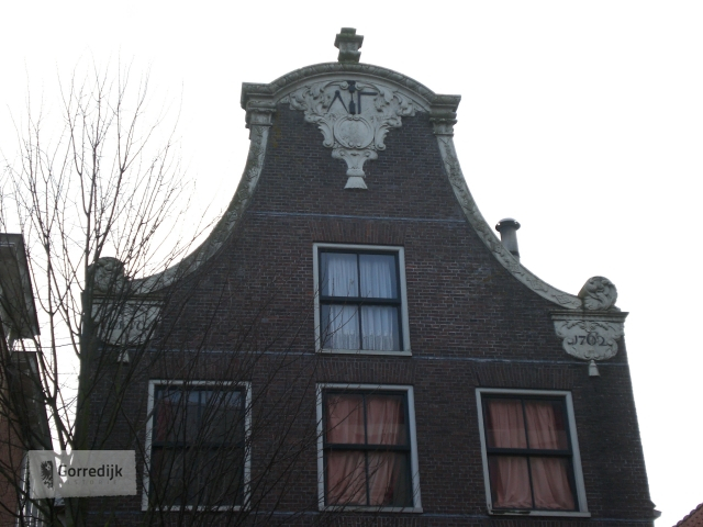 | Pand onder zadeldak tegen klokgevel onder de aanzetkrullen gedateerd 1776. In de top zesruitsvensters. | |