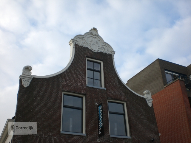 Pand onder zadeldak tegen klokgevel met gebeeldhouwde aanzetkrullen en bekroning. Onder de aanzetten gedateerd 1805. | Aanzetkrullen gedateerd 1805 Klokgevel
