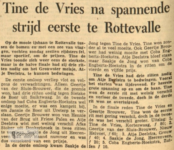 De duisternis was al ingevallen en de lampen op de baan schenen al, toen eindelijk de eindstrijd aanbrak van de vrouwenrijderij, die de IJsvereniging V.V.V- te Drachten gister had georganiseerd. Huiverend van de kou — en een beetje van de zenuwen — stonden ze naast elkaar aan de start: de robuuste Tine de Vries uit Kortezwaag en de tengere Afke Stoker uit Donkerbroek. Tine de Vries was met niet al te veel moeite in de finale doorgedrongen, alleen in de halve finale moest ze het opnemen tegen Rina Kooij van Wieringen, die zij echter gemakkelijk en met ruim verschil wist te verslaan. Afke Stoker had zich naar de finale toe moeten vechten, in opwindende ritten, die het uiterste van haar vergden. Maar ze had als badjuffrouw van het Drachtster zwembad de nodige supporters op het ijs: allemaal leerlingen, die juffrouw luide aanmoedigden. Na een zenuwslopende start, flitsten de beide meisjes tenslotte weg. Als schimmen schoten zij over het ijs. Tine de Vries stoof voort met furieus geweld. Halverwege de baan deed Afke nog een krampachtige aanval. Toen moest zij het hoofd buigen; Tine won met meters verschil. Ook in de tweede rit, tegen de wind in, was Tine niet te benaderen.