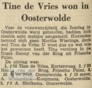 Tine kwam dus in de finale uit tegen Afke Stoker, die ze versloeg, zoals hierboven is beschreven. De uitslag was als volgt: 1. Tine de Vries ƒ75 plus medaille; 2. Afke Stoker, ƒ 55; 3. Annie Poepjes— de Vries ƒ 35; 4 en 5: Geeske Hielkema n Rina Scheltus-Kooij, elk ƒl5. Er werd gereden volgens prestatie-systeem, zodat de andere rijdsters resp. elk ƒ 8 en ƒ 4 ontvingen, al naar gelang de omloop, die ze hadden bereikt.