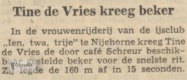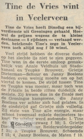 Het Drentse plaatsje Vries had gisteren de primeur van de eerste grote strijd tussen de snelste Groningse, Friese en Drentse meisjes op de schaats. Ruim vijftienhonderd toeschouwers hebben hier een zeer aantrekkelijke wedstrijd gezien, die zijn hoogtepunt kreeg in de ontmoeting tussen Tine de Vries en de Groningse kampioene Grietje Dieterman—Schuur. Jammer was het dat dit niet de eindstrijd was, want door een ongelukkige loting kwamen deze twee meisjes in de derde omloop tegen elkaar. Tine won het duel met zeer veel moeite, waarna zij gemakkelijk naar de overwinning reed, ook al boden Lucie Koops (in dé halve finale) en Arina Struik verbeten tegenstand.