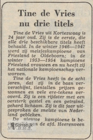 Tine de Vries, de 23-jarige boerendochter uit Kortezwaag heeft Zaterdagmiddag de hoogste schaatstitel voor vrouwen in Nederland gegrepen. Daarmee heeft zij de kroon gezet op een schitterende schaatscarrière. Die carrière begon jaren geleden reeds. In 1947 veroverde zij met gemak in Oldeboorn het kampioenschap voor meisjes. In de volgende jaren werd haar naam met steeds meer ontzag uitgesproken op de banen. Verleden jaar was zij eigenlijk niet te verslaan; Martha Wieringa was de enige, die haar aan kon. Maar Tine de Vries behaalde op 20 Januari 1954 het kampioenschap van Friesland door Martha in de laatste finale rit te verslaan. Dit seizoen, nu Martha op het toneel ontbrak, was Tine de sterkste op alle banen. Niemand kon haar verslaan. Alleen verleden week kreeg zij een kleine inzinking en in Gorredijk wist Geertje Brouwer haar te verslaan. Het kampioenschap van Friesland moest zij zich laten ontglippen zonder dat zij ervoor kon vechten. Maar Zaterdagmiddag heeft zij zich glansrijk hersteld. Zij bewees duidelijk, dat zij op het ogenblik de sterkste is van de vrouwenrijdsters in Nederland. Tine de Vries is er het meisje niet naar, dat haar de eer, die haar op de banen te beurt valt, naar het hoofd zou stijgen. Zij blijft onder alles eenvoudig, nuchter en kalm en laat zich door niets en niemand van de wijs brengen. Zij heeft haar kampioenschap niet alleen te danken aan een grondige training en een jarenlange routine, maar ook aan haar persoonlijke eigenschappen: een harde wil, een ongebreidelde vechtlust en een grote dosis „Fryske fülens".