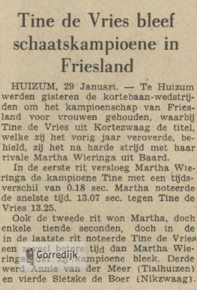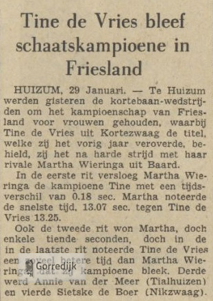 Tine de Vries (links) liet, nadat zij de Friese kortebaantitel had behaald, haar gevaarlijkste concurrente Martha Wieringa van harte meedelen in de hulde en glorie. En dit tekent niet alleen de sfeer op de vrouwenrijderijen, maar vooral het karakter van de nieuwe kampioene, een opgewekte boerendochter van 22 jaar, die sportiviteit boven alles stelt. Tine de Vries heeft deze titel vooral te danken aan haar ongebreidelde strijdlust en bikkelhard moreel en deze eigenschappen heeft zij kunnen ontwikkelen in een ijscarrière van reeds heel wat jaartjes. Want na vele wedstrijden voor schoolkinderen verscheen Tine aldra op de meisjesrijderijen. En toen zij vijftien jaar was, begin 1947, behaalde zij in Oldeboorn al de Friese meisjestitel. Zij was dus al een beetje aan huldigingen gewend, toen zij gisteren opnieuw in het zonnetje gezet werd. En misschien was zij daarom ook zo weinig zenuwachtig op deze kampioensstrijd. Voor de beslissende rit tegen Martha Wieringa zei zij nog: Ik haw niks gjin pine yn 't liif". In Tine heeft Kortezwaag een ingezetene, waarop het werkelijk trots kan zijn!