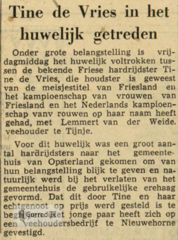 Juster waeiden der oan de Hegedijk yn Koartsweagen, de ein, dy't tichte by de Gordyk oanleit, fan forskate huzen flaggen. Hwant it wie de dei, dat de bikende hurdrydster Tine de Vries troude mei Lambert van der Weide üt de Tynje. Dat barde yn it gemeentehüs yn Beetstersweach troch de hear H. Hofstra, dy't yn syn sympatike taspraek in oanknopingspunt foun yn it koartebaenriden troch de breid. Lyk as wenst is by hurdrydstershoullken, stie nei it trouwen foar it gemeentehüs in greate rige Fryske hurdrydsters klear mei de redens yn de hlchte, ünder hokker poarte it jonge pear troch gyng. Der wie in hiele smite minsken op ta setten kaem. De jouns is yn in stiiffolle seale fan hotel Veensma op 'e Gordyk bruiloft fierd. It wie in sellige en treflike joun mei hiel hwat fordivedaesje oan sang muzyk en foardracht, mei in flotte lieding fan de hear Jouke de Vries.